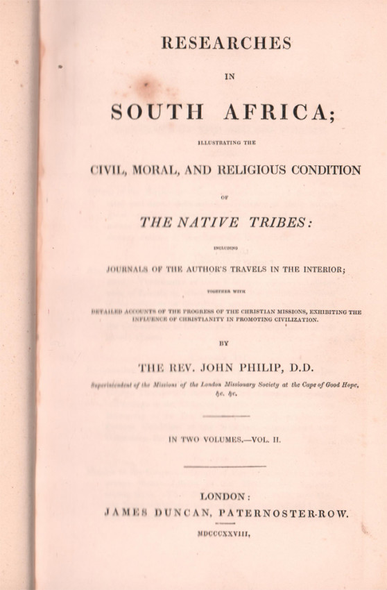 Rev John Philip’s horror at the oppression of the Khoi at the Cape, as well as the regular district commando organized killings of the San, led to the writing and the publication of this book. Largely as a result of his findings and the impassioned pleas in the book, as well as his partnership with the likes of William Wilberforce and Thomas Fowell Buxton of the Anti-Slavery Society, Philip gained a tremendous victory in the British Parliament in 1828. As a result, and by way of Ordinance 50 of 1828, it became mandatory in the Cape colony for all of “the King’s” subjects to share the same civil rights. This meant that (in law at least) all races could buy land anywhere, buy a house in any part of town and, when the vote came (in 1852), qualify for it in exactly the same way as whites. It meant equal pay for equal work, at least some integrated schools, and many other things peculiar to the colony, all of which continued until the Union of South Africa was created in 1910, when these freedoms were traded to placate the ZAR (Transvaal) and Orange Free State constituents.