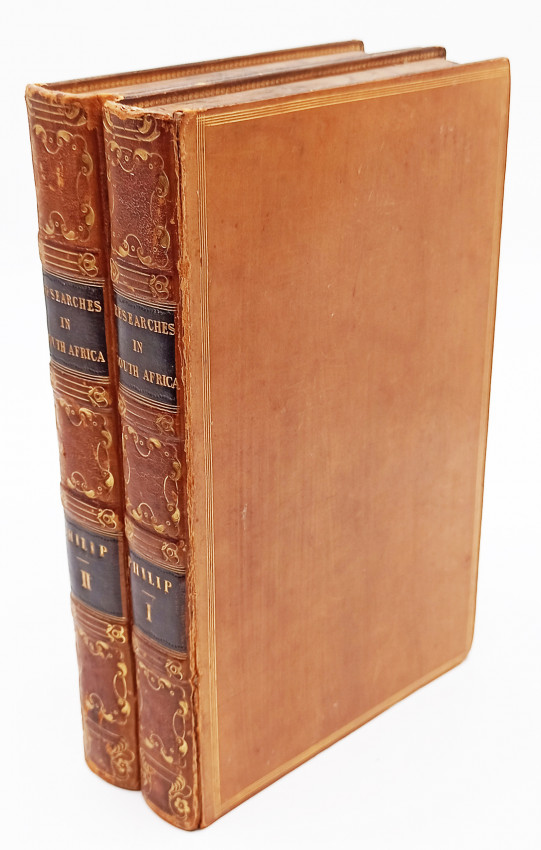 First edition: Two volumes: Vol. 1 xxxv + 403: Vol. 11 + viii + 450 pages (+ 1 leaf instructions to binder and errata with an advertisement for Thomas Pringles’ Ephemerides on the verso), frontispiece in volume 1 (the village of Bethelsdorp) and folding map as frontispiece to volume 2, sketch map of Theopolis in Vol. 2, book plates on the front paste down end papers, binder’s ticket on the front paste down end paper in vol. 1, light foxing mainly on the preliminary pages, full calf binding with decorative gilt and black title labels gilt on the spines, inner gilt dentelles, marbled end papers and edges, a very good set.
