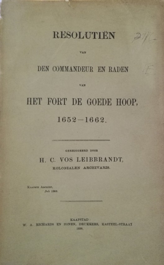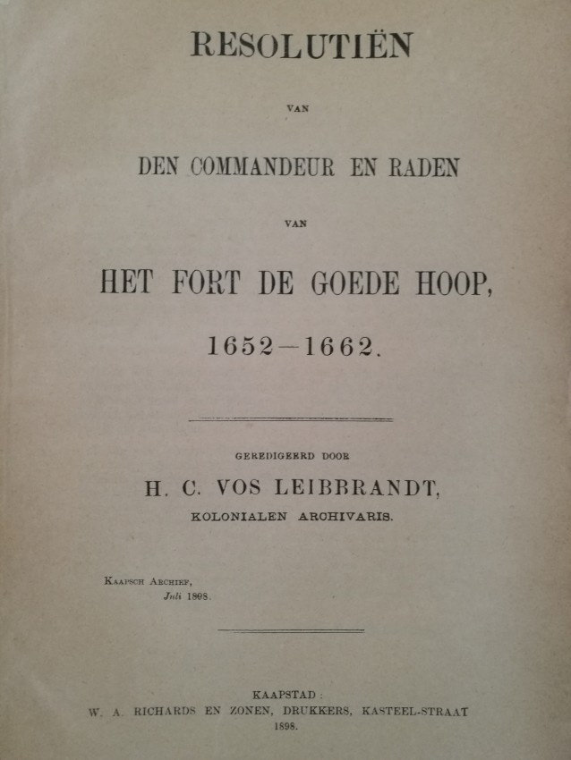 These resolutions, signed by Johann van Riebeeck and other members of the Council of the Fort (or Castle) from time to time, cover the period of some nine years from just before Van Riebeeck's ships reached the Cape in 1652 until shortly before his term of office expired.