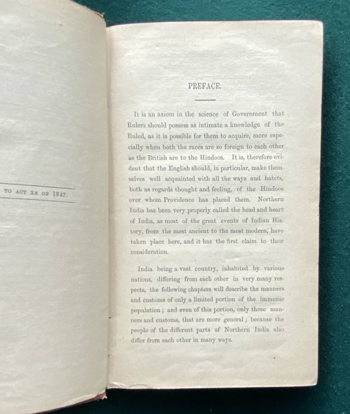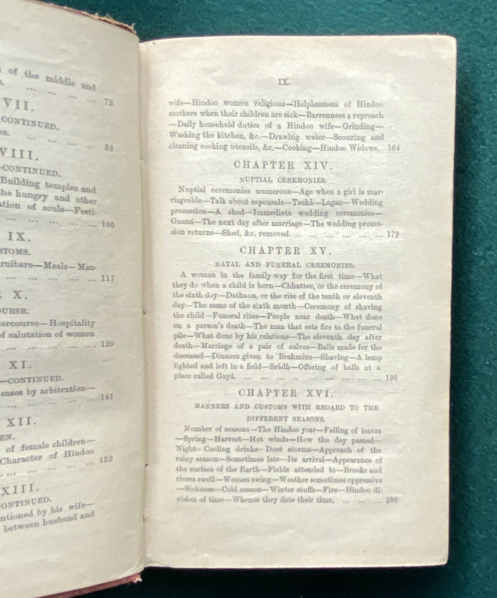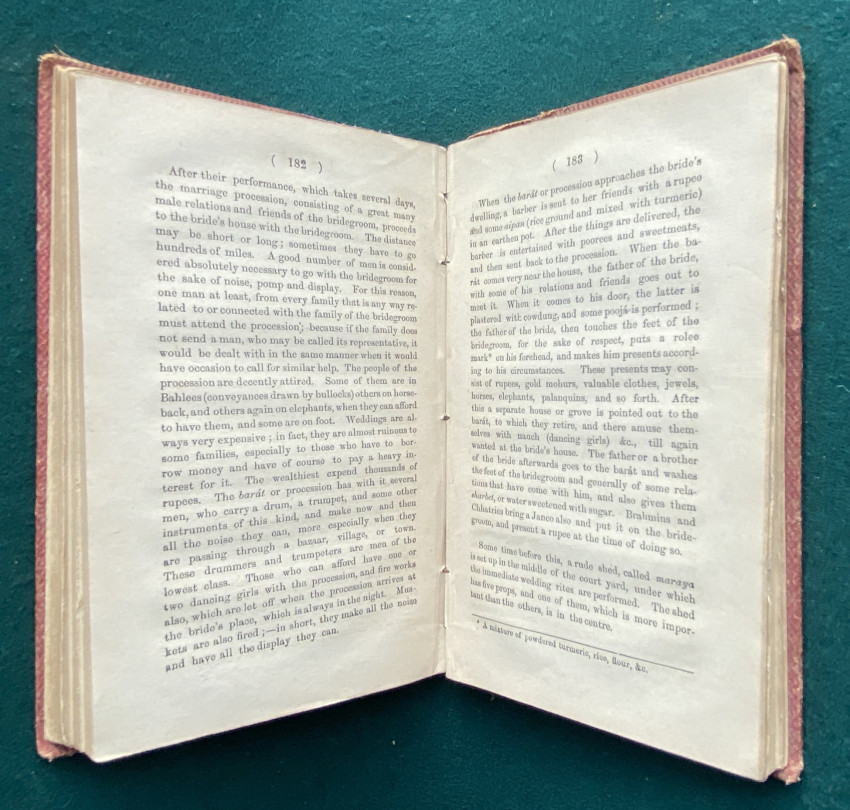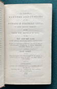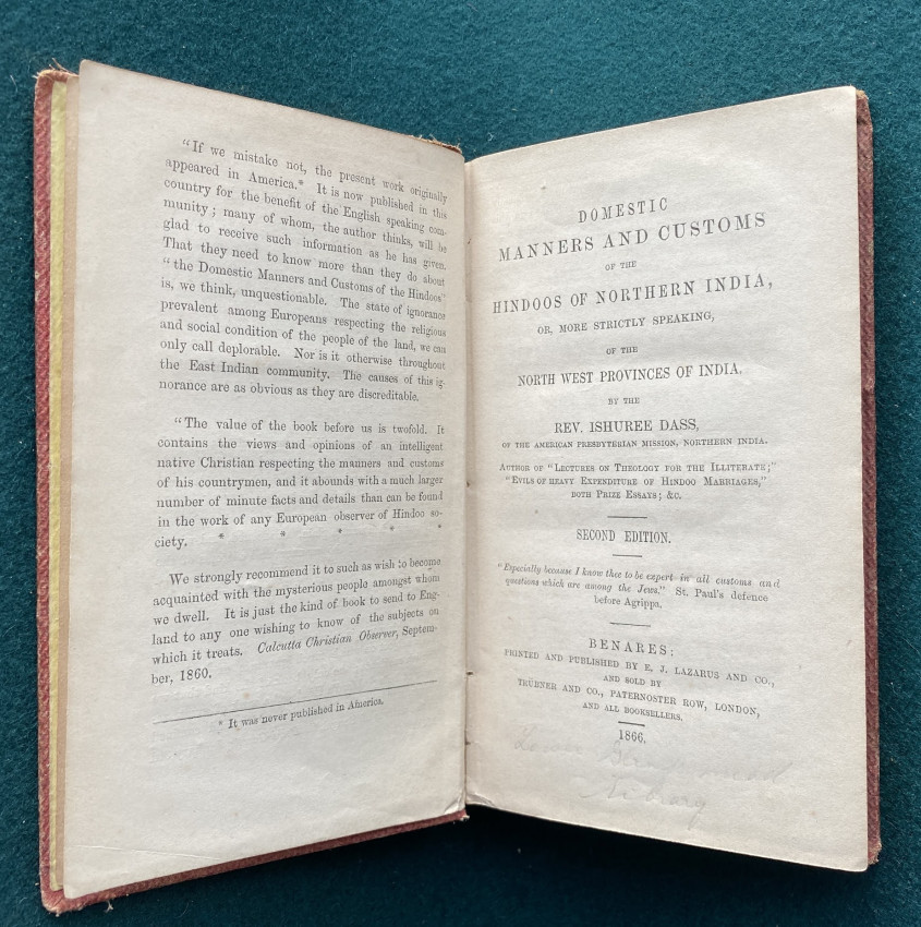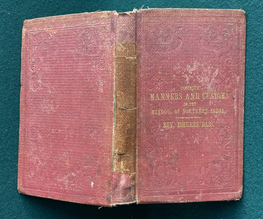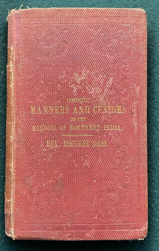 Rev. Ishuree DASS (1826-1867). Domestic manners and customs of the Hindoos of Northern India, or, more strictly speaking, of the north west provinces of India … Second edition. Benares: printed and published by E.J. Lazarus & Co., and sold by Trubner & Co., 1866. 12mo (7 x 4 ¼ inches; 178 x 108mm). Pp. [I-]VIII-XI[-XII; 1-]280. (Marginal damage to pp.65/66, 69/70 and 131/132). Original red patterned cloth, lettered in gilt and blocked in blind, cream-glazed endpapers (damage to spine, some soiling, corners rubbed). Provenance: Lower Kingsmead Library (partially erased inscription at foot of title, p.45 inscription, pencilled underlinings or notes on pp. 32, 109, 111, 112, 113, 193, 195, 203).