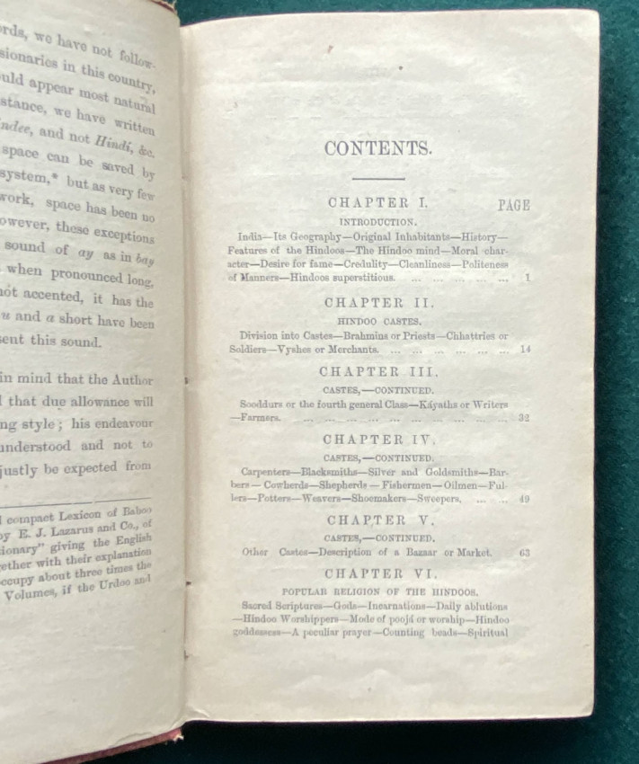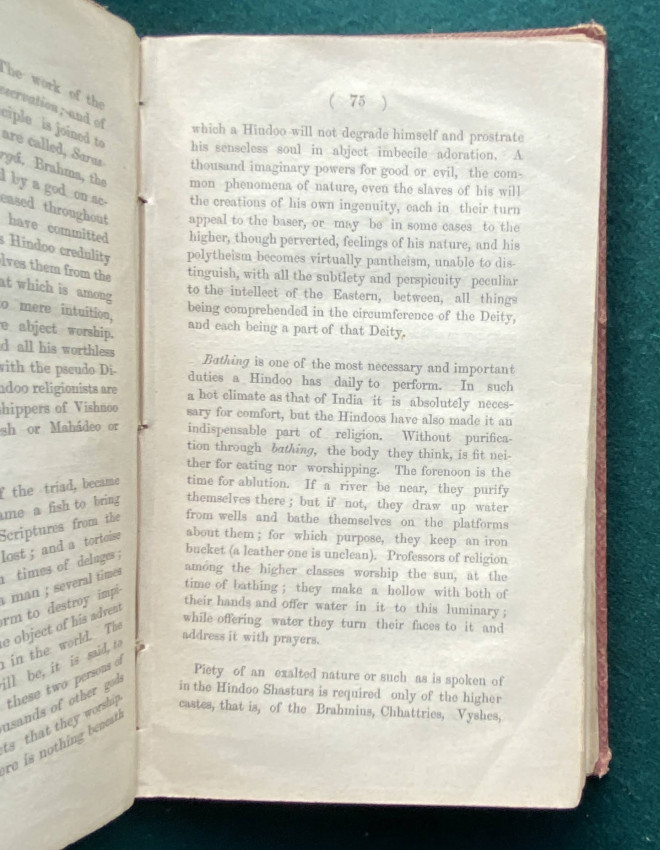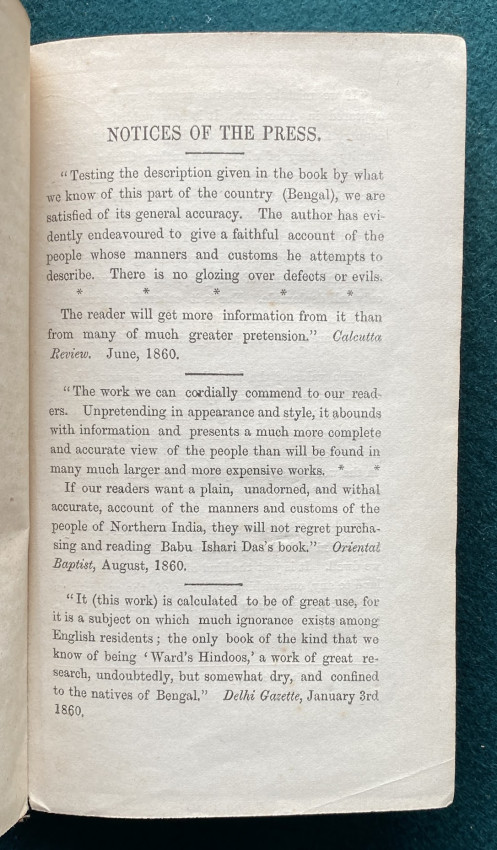 A second edition of a rare work, first published in 1860. The author “a Presbyterian minister, was born at Futtehpoor, India, in 1826. He was educated in the mission-school there, and, on a visit to America, entered Lafayette College, Easton, Pennsylvania, but was compelled to return to his native land without graduating. He continued his studies with the English missionaries; and, in 1865, was licensed by Furruckabad Presbytery, and stationed at Futtehpoor, where he died, May 2, 1867.” (https://www.studylight.org/encyclopedias/eng/mse/d/dass-ishuree.html)