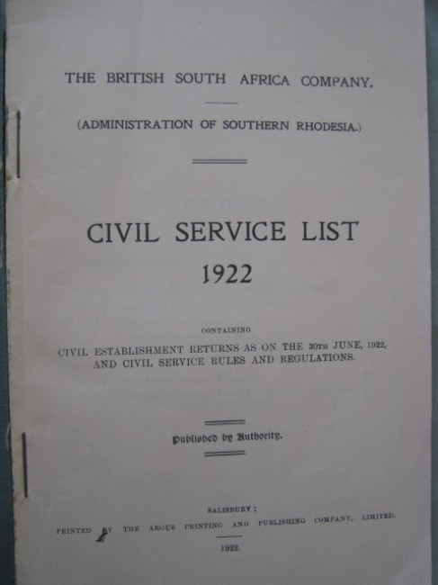 Blue card covers drawn on to xv + 81 pp of alphabetical index of civil servants followed by Parts I (Civil Establishment) and II (Civil Service Rules and Regulations).