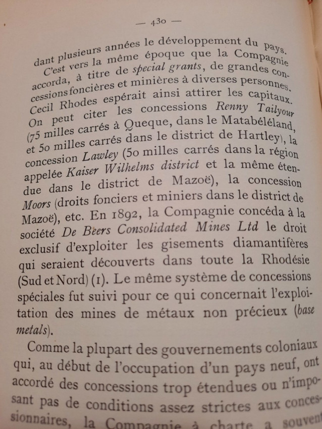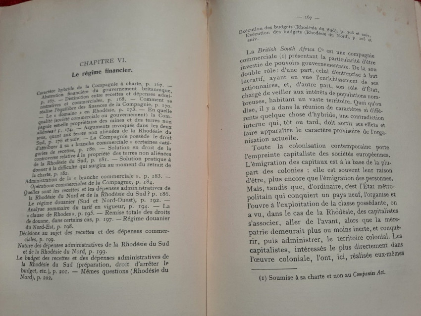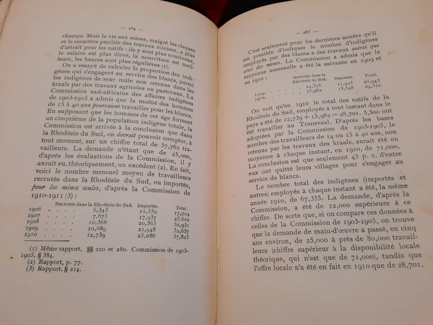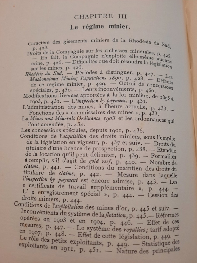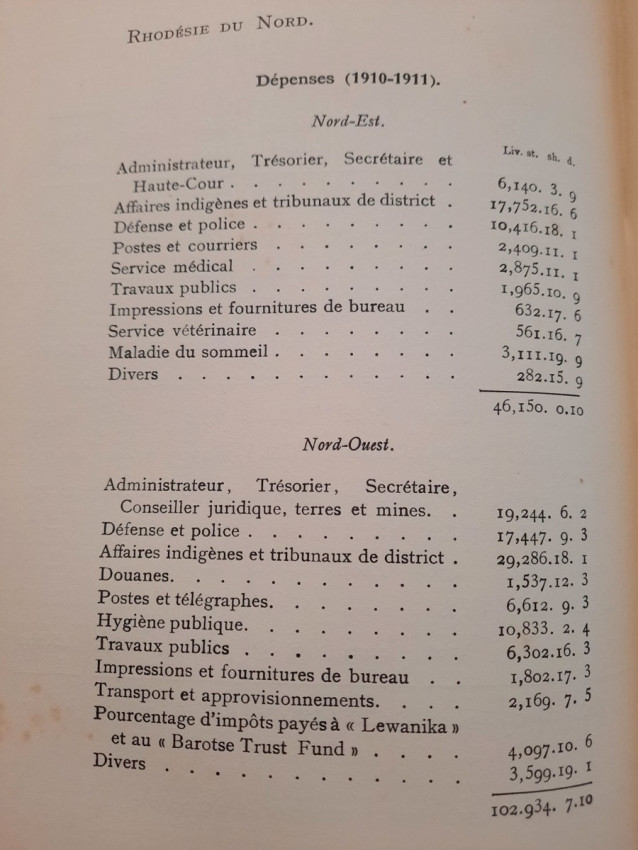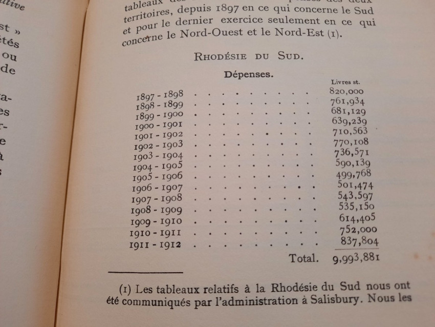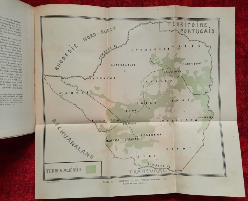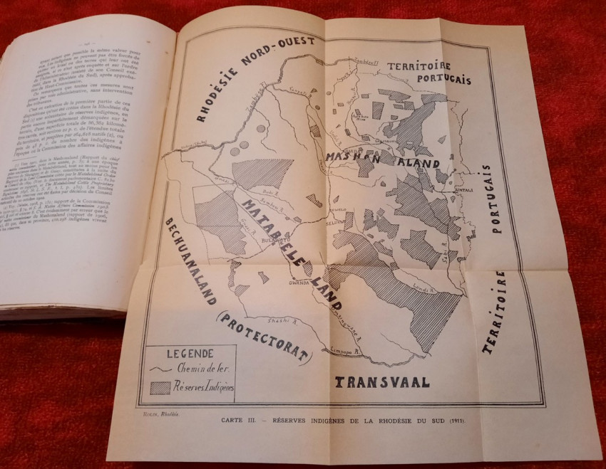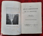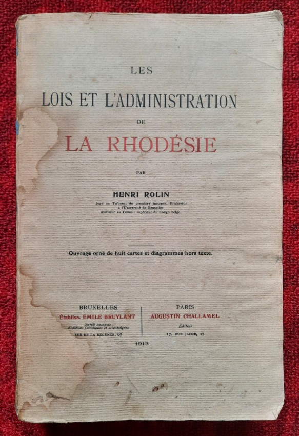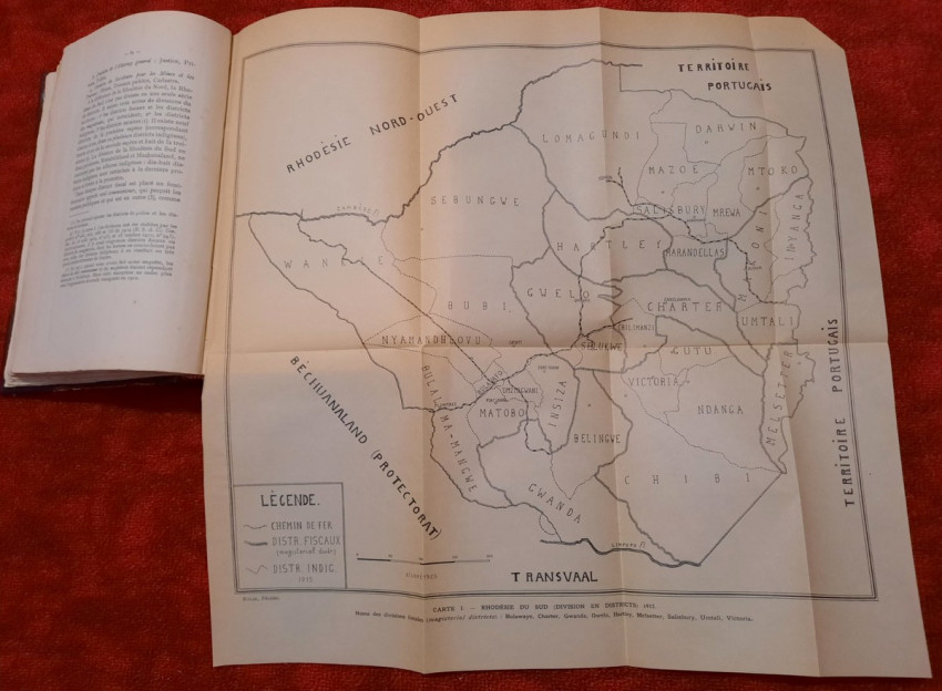 "Les lois et l'administration de la Rhodésie."; Original paperback binding; Text in French; Collation complete - 532 pages, with 7 folding maps, diagrams and numerous tables; Binding in fair condition, with traces of humidity. Otherwise, the content/text block bright and very clean, occasional ligh foxing to the white margins, only the frontispiece shows signs of humidity. Some pages uncut. All maps and tables in excellent condition.
