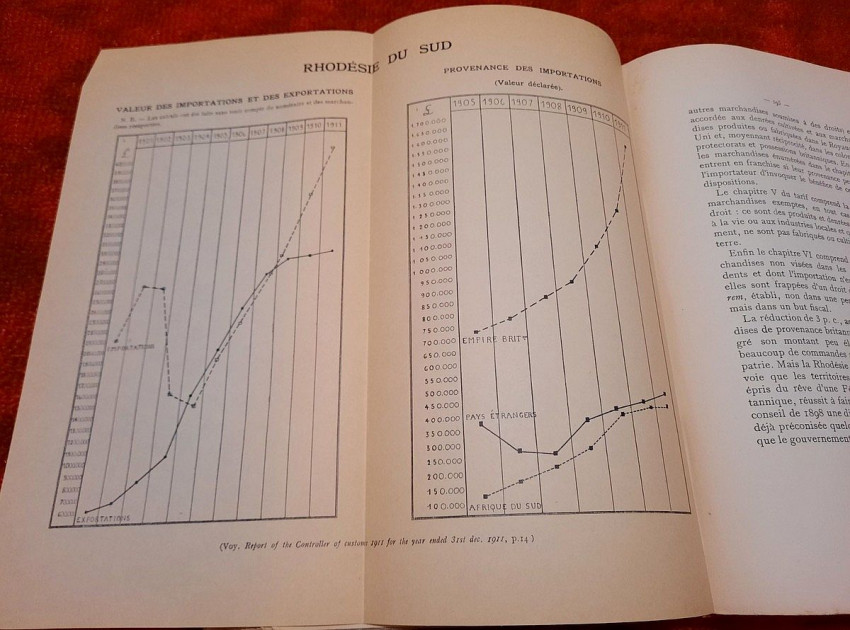 4) Folding table with Value of Imports and Exports & Origin of Imports of South Rhodesia (taken from Report of the Controller of Customs from 1911), (26 x 25 cm)