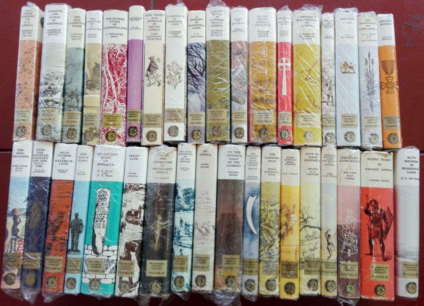 A complete set of 36 volumes of the gold series of the Rhodesiana Reprint Library. Facsimile reprints of the originals. All volumes have dust jackets, only a couple have slight wear to head of spine. The volumes have been wrapped in removable plastic. The series includes classics of hunting, African exploration, missionary reports, biography, and military. Authors include J Theodore Bent, Lord Randolph Churchill, Thomas Baines, Lionel Decle, Frederick Courtney Selous, Melina Rorke and others. A wonderful collection of books in very good condition.