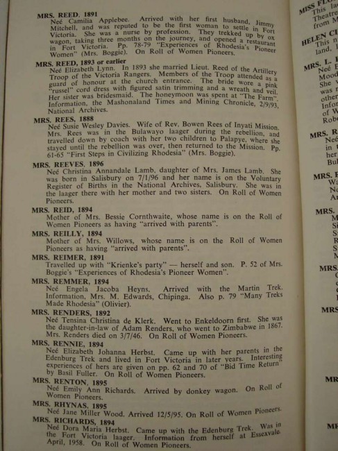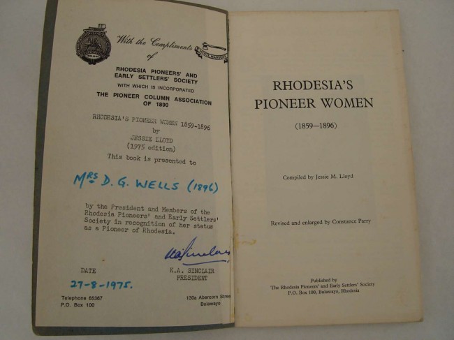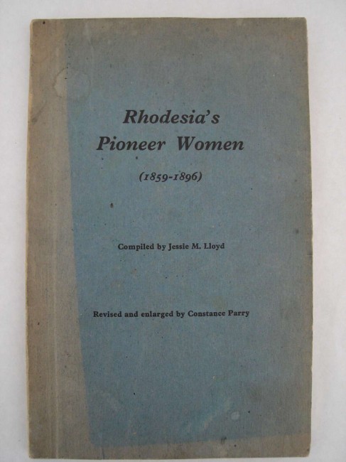 Jessie M Lloyd's original list (1960) has been added to and corrected where necessary by Constance Parry, on behalf of the Rhodesia Pioneers' and Early Settlers' Society. The reasons for this, and the names of others who assisted with the revision are given in an introduction by Constance Parry. There is a detailed Bibliography, a note from the Society's secretary, the original Preface by Jessie m Lloyd and a foreword by R.C.Tredgold. The frontispiece of this small book is a black-and-white photograph of Jessie Lloyd. Of special interest is that this book was presented to an early pioneer woman in recognition of her status as a Pioneer of Rhodesia, and the presentation document is attached to the inside front cover.