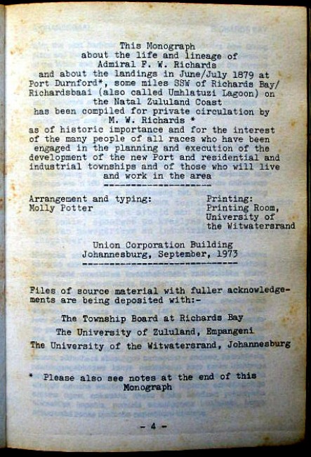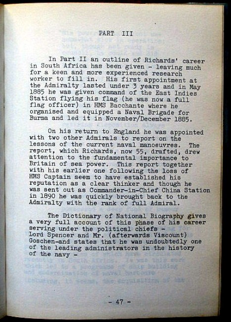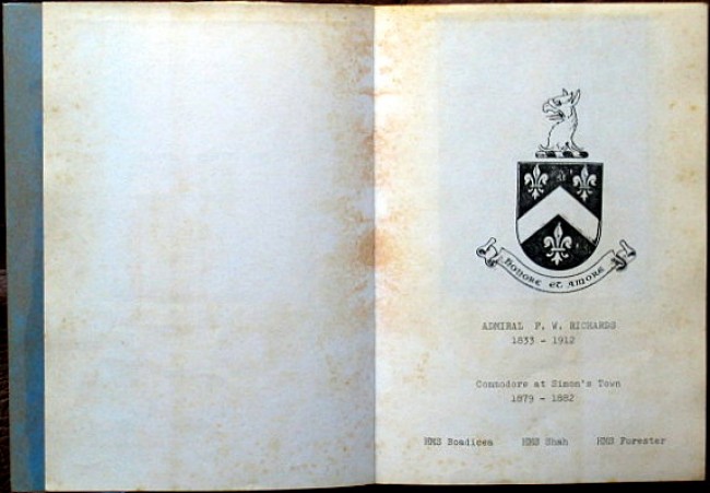 73pp. Hardboard cover with DW. Compiled for private circulation only. Illustrated with numerous line drawings, copies of handwritten notes and other interesting bits and pieces from the Admiralty. Includes a loosely tipped-on colour photograph of Admiral Richards.