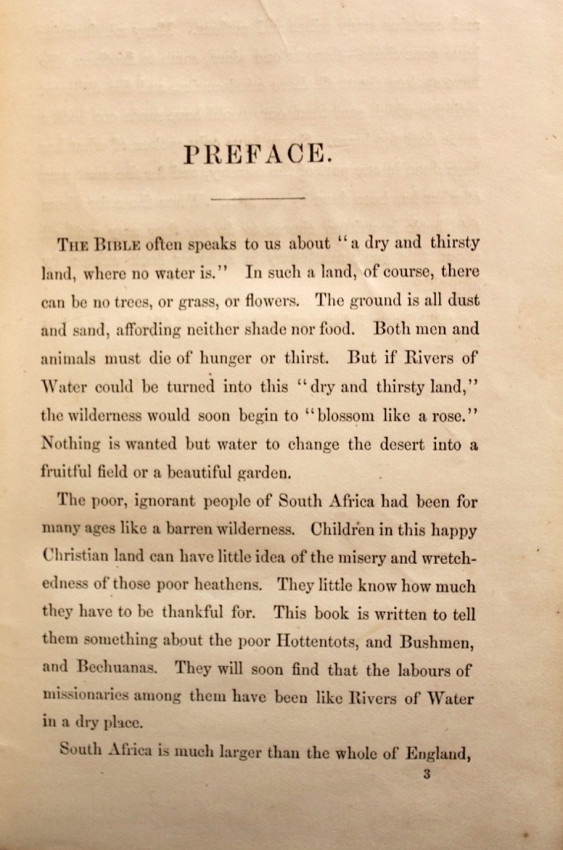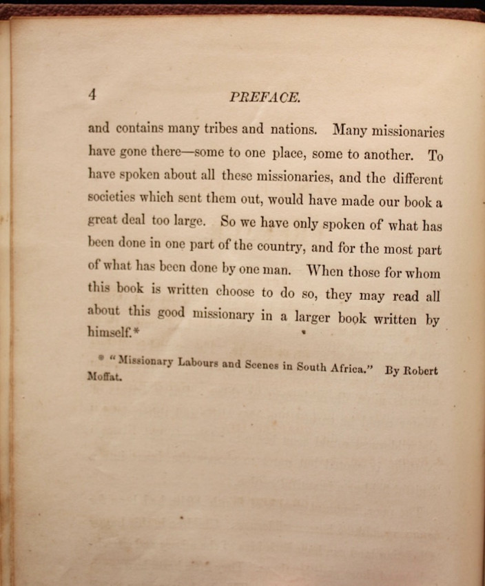 An account of Robert Moffat's Missionary Labours and Scenes in South Africa, specially prepared for the use of children. Mendelssohn (Vol.II, page 30) states that the volume was largely circulated in Great Britain and South Africa. This American edition indicates that the little volume enjoyed a fair bit of circulation in the States as well.