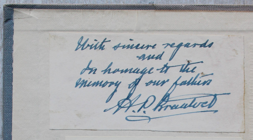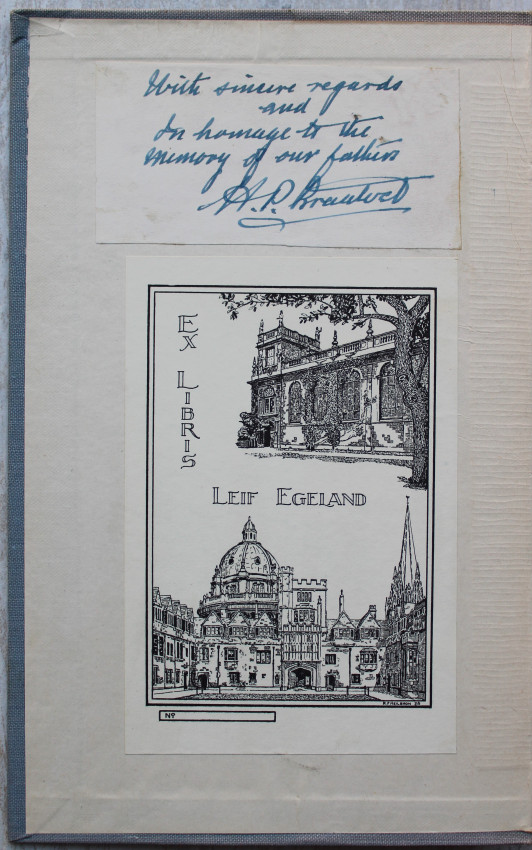 Inscribed above the bookplate: With sincere regards and in homage to our fathers, H P Braatvedt.