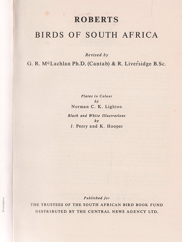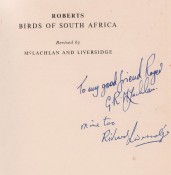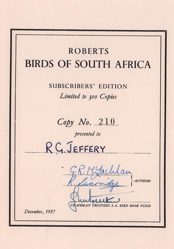 The limitations page is tipped in and reads; Subscribers' edition limited to 300 copies. Copy number 210 presented to R.G. Jeffery signed by McLachlan and Liversidge and the chairman of the SA Bird Book Fund.
