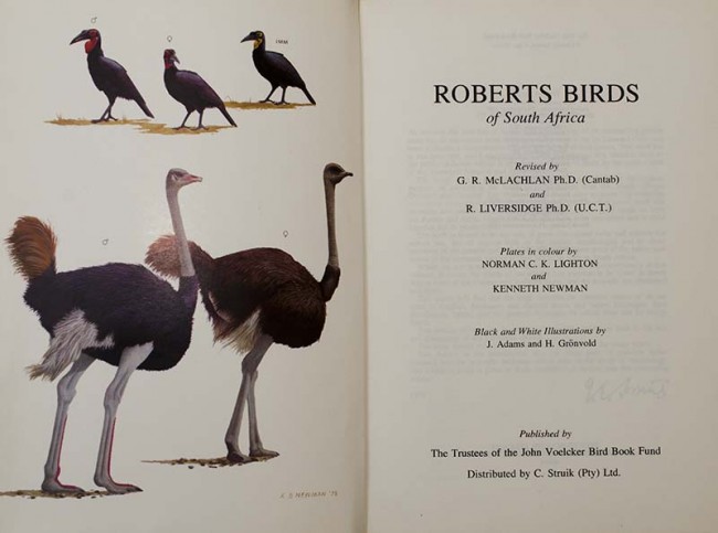 The book contains the common names of all the birds in English, Afrikaans, and Eastern Bantu and Native languages, their distribution, habits, and the general characters by which they can be recognized. Plates in colour by Norman C.K. Lighton and Kenneth Newman, Black and white illustration by J.Adams and H. Grönvold.