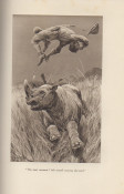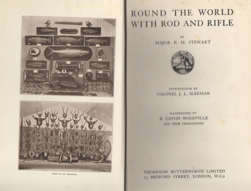 In a work of wide ranging sporting adventures, Stewart relates hunting elephant, rhinoceros, lechwe, tsebbe and lion in various parts of Rhodesia. There are also chapters on shikar in India for blackbuck, fishing for Shark, Swordfish, and Tarpon, trout fishing in New Zealand -- a real mix of sporting activities. While there are interesting photos throughout, this book is highlighted by the stirring drawings of R. Caton Woodville. Green cloth with gilt rhino on upper boards and gilt spine titles. Spine lightly sunned, titles still bright. Front inner hinge started, rear firm and tight. A very good copy.