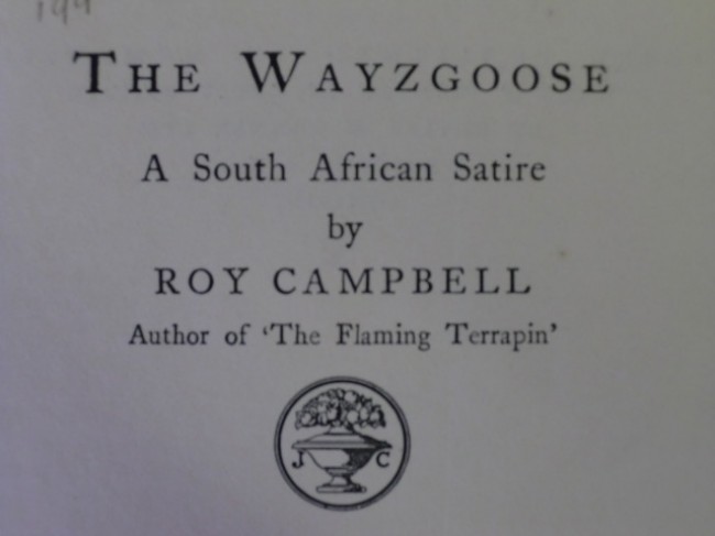 \'The Wayzgoose\' and \'poems of Roy Campbell\' both first edition. The first has no jacket, contents clean, cloth boards fairly worn but good; the second is lacking the f.f.e-p. but contents good, and jacket very good, though spotted.