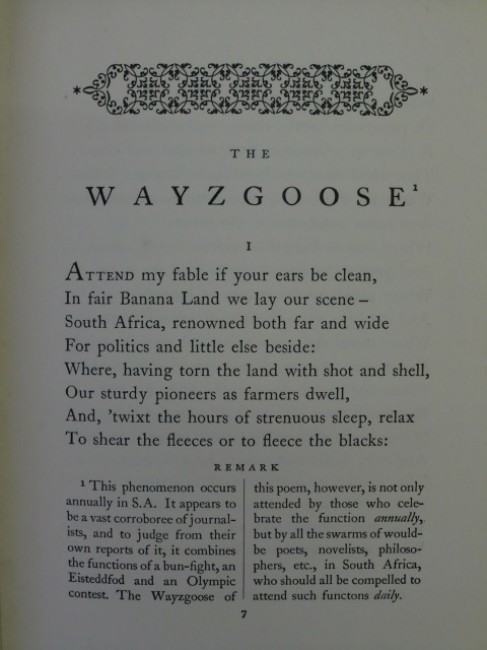 \'Attend my fable if your ears be clean, In fair Banana Land we lay our scene - South Africa, renowned both far and wide For politics and little else beside: Where, having torn the land with shot and shell, Our sturdy pioneers as farmers dwell, And, \'twixt the hours of strenuous sleep, relax To shear the fleeces or to fleece the blacks: Where every year a fruitful increase bears Of pumpkins, cattle, sheep, and millionaires -\'[The Wayzgoose, extract].