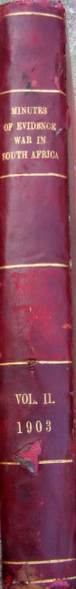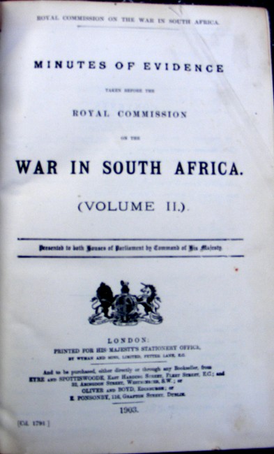 Presented to both Houses of Parliament by Command of His Majesty. Royal Commission on the War in South Africa, 1903. Half leather, 720 pages, gilt lettered POSTMASTER GENERAL on front cover. Previous owner's signature on second page, 220 x 325mm, spine has been repaired. Corners show wear. Condition: fair