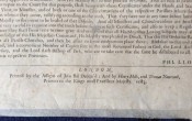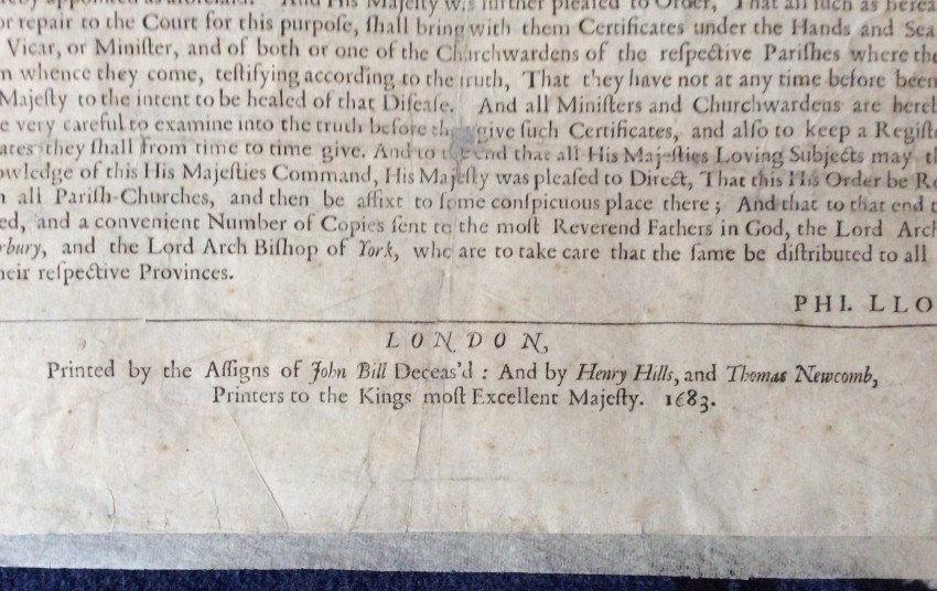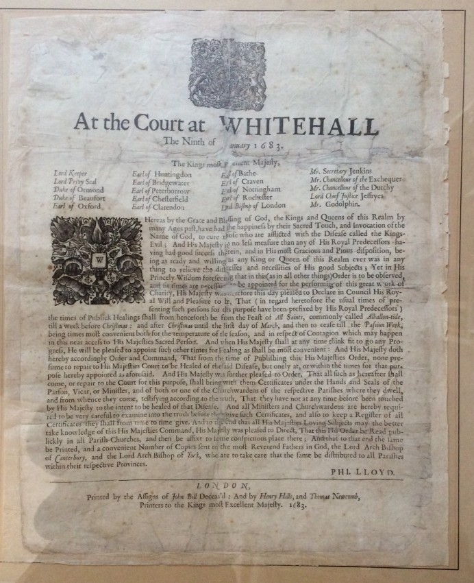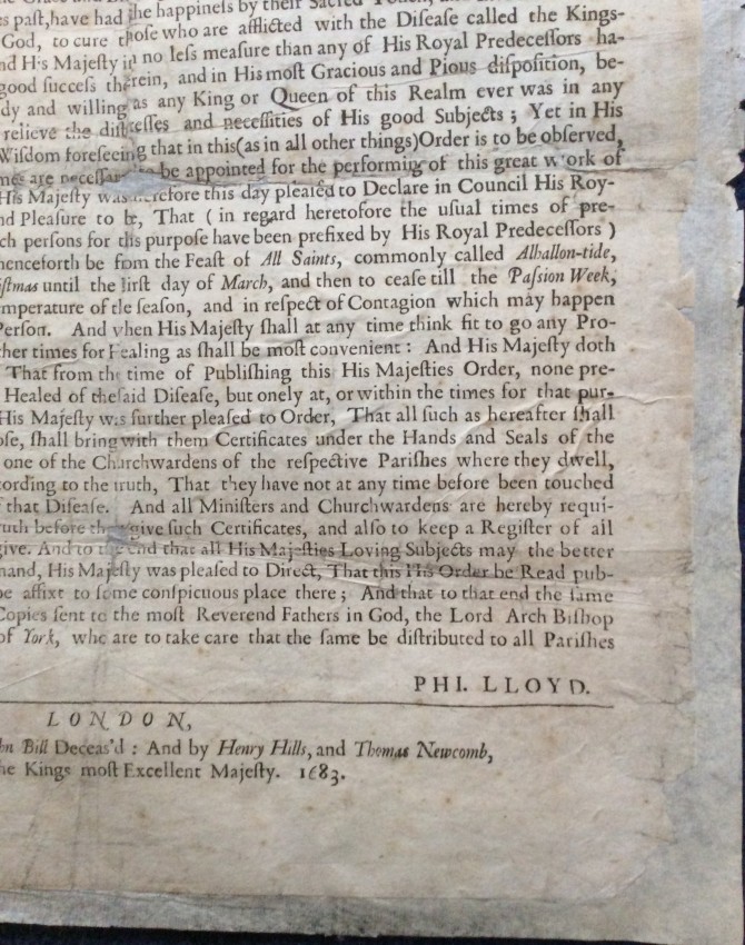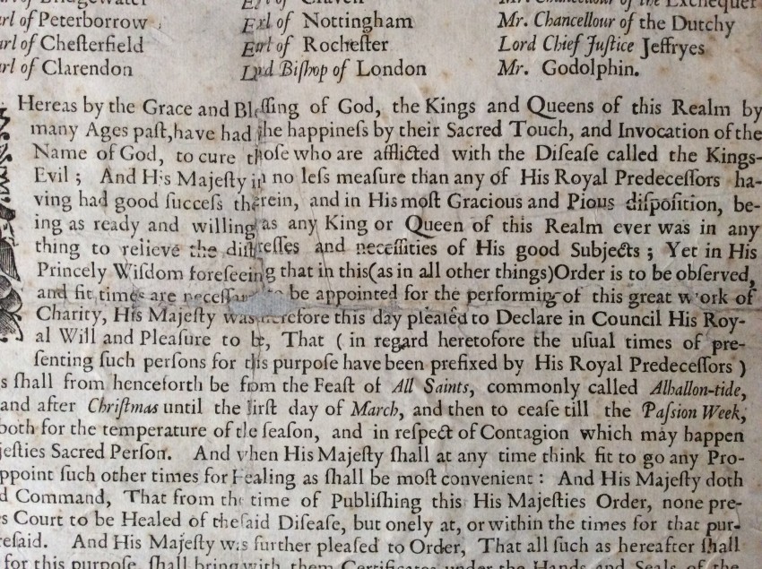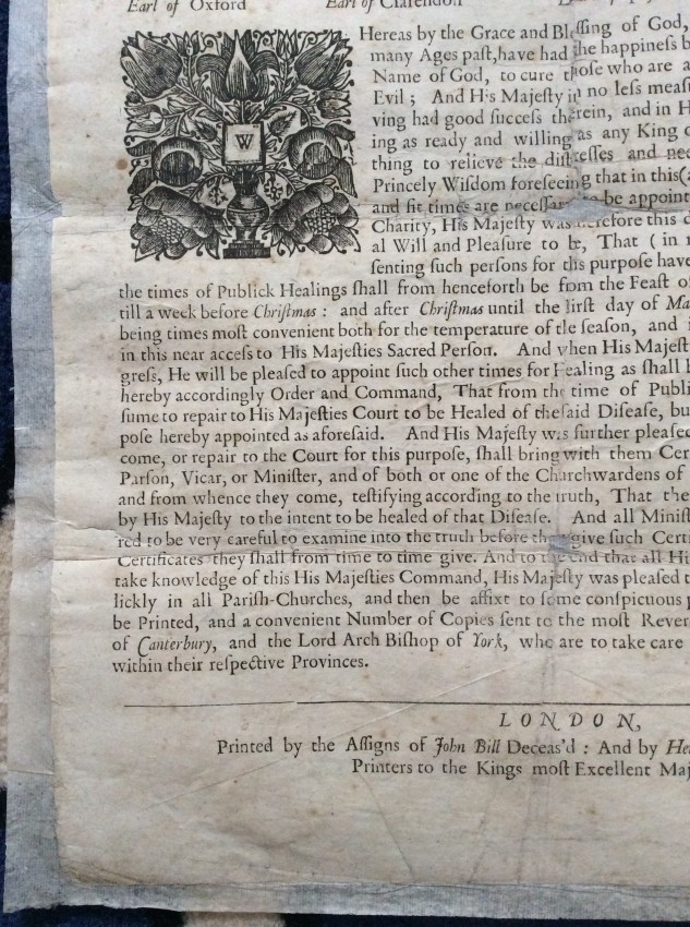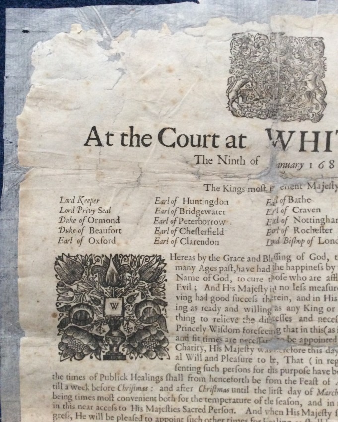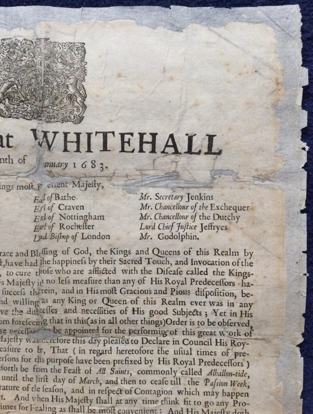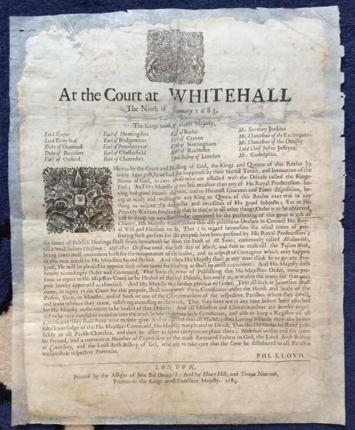 [Royal Medical Broadside, cure for Scrofula] "At the Court of Whitehall the Ninth of [J]anuary 1683. … Whereas by the Grace and Bl[e]ssing of God, the Kings and Queens of this Realm by many Ages past, have had the happiness by their Sacred Touch, and Invocation of the name of God, to cure those who are afflicted with the Disease called the Kings-Evil … His Majesty was therefore pleased to Declare in Council His Royal Will and Pleasure to be, That …the times of Publick Healings shall from henceforth be from the Feast of All Saints … till a week before Christmas: and after Christmas until the First day of March …".