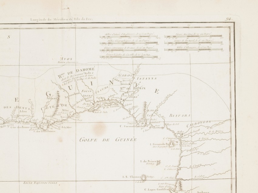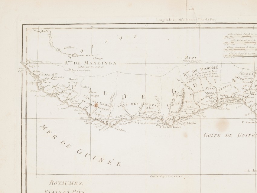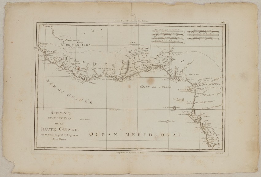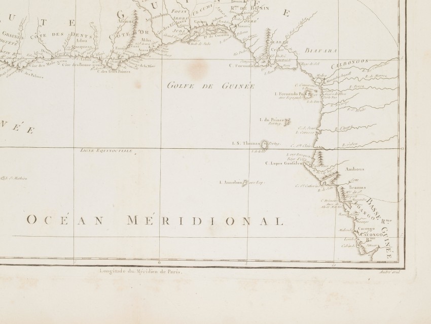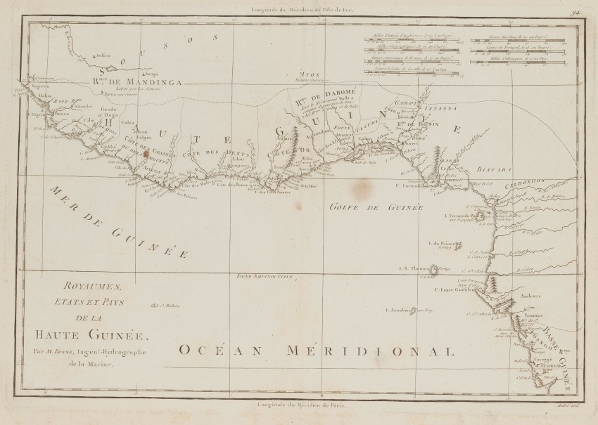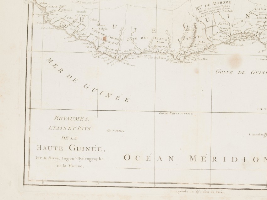 Very beautiful map by Rigobert Bonne featuring the Gulf of Guinea, former reigns of Upper Guinea (modern-day Senegal, Guinea, Sierra Leone, Liberia, Cote D’Ivoire, Ghana, Togo, Benin, Nigeria, Cameroon, Gabon, Congo, Angola).