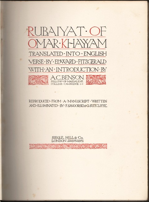 Translated into English Verse by Edward Fitzgerald. With an Introduction by A.C. Benson. Reproduced for a Manuscript Written and Illustrated by F. Sangorski & Sutcliffe.