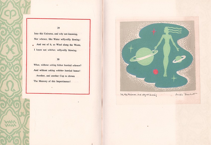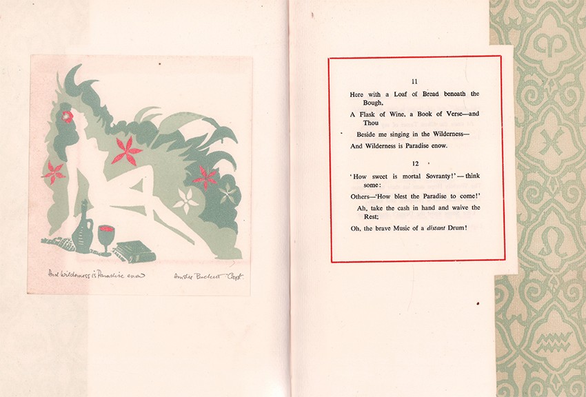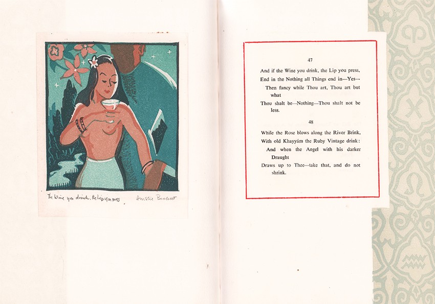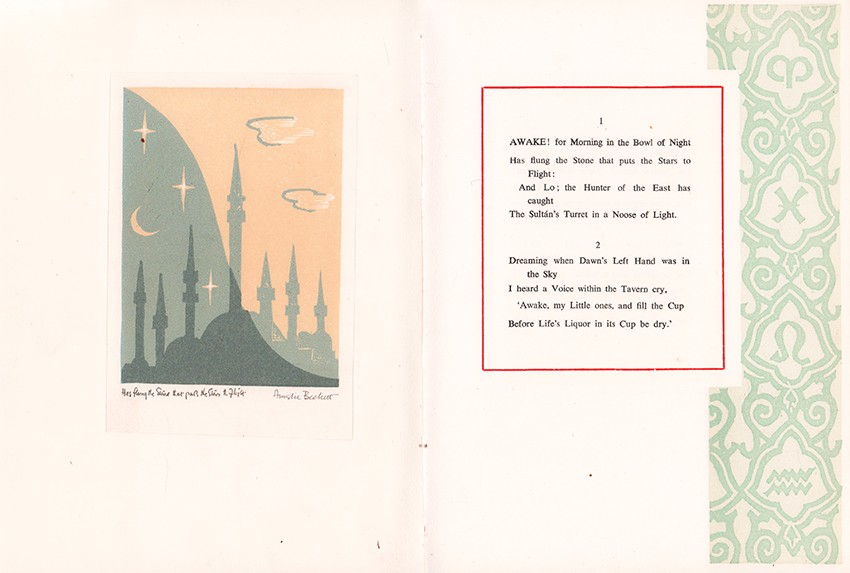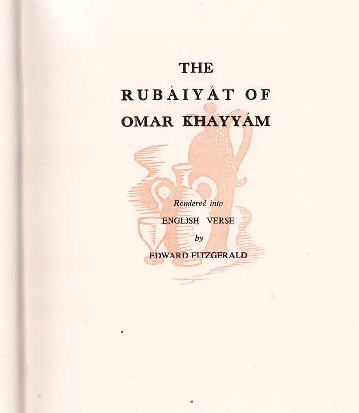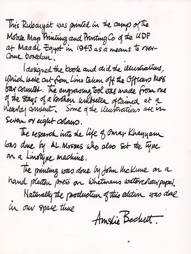 This Rubaiyat was printed in the camp of the Mobile Maps Printing and Printing Co of the UDF (Union Defence Force) at Maadi Egypt in 1943 as a means to overcome boredom.