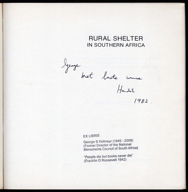 A survey of the architecture, house forms and constructional methods of the black rural peoples of Southern Africa. 208 pages, illustrations, line drawings, library stamp and an ainscription from a previous owner on the half-title page, orange pictorial card wrapper slightly worn and creased along the spine.