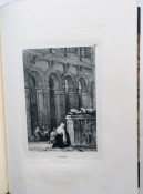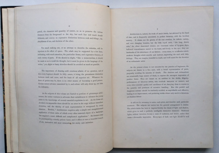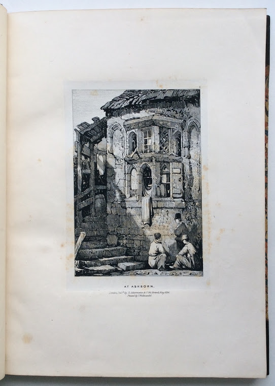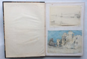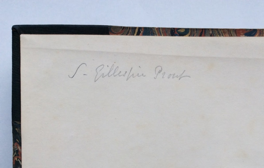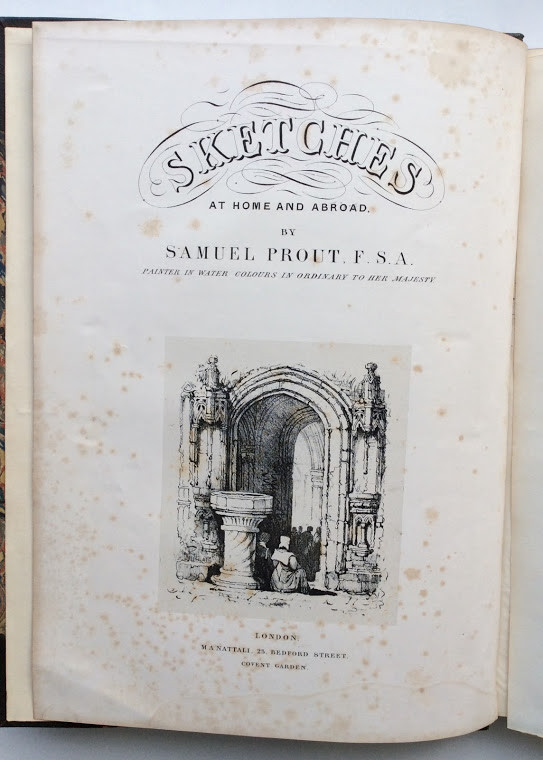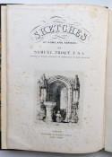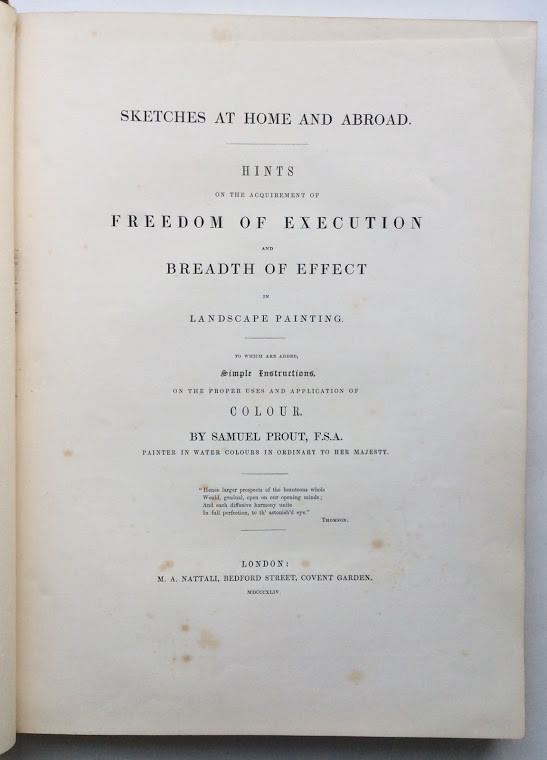 Samuel PROUT (1783-1852, artist). Sketches at Home and Abroad. Hints on the Acquirement of Freedom of Execution and Breadth of Effect in Landscape Painting. To which are added, Simple Instructions, on the proper uses and application of Colour. By Samuel Prout ... Painter in Water Colour in Ordinary to Her Majesty. London: M. A. Nattali, 1844. Imperial 4to. Pp. [1-]16. Lithographed additional title (with mounted lithographic vignette on India paper), lithographed plate list at end with mounted lithographic decoration, 48 lithographed plates, each on india paper mounted, EXTRA-ILLUSTRATED with an original pencil sketch by Samuel Prout of Weymouth in Dorset, England, and a pencil and wash sketch of Hurstmonceaux Castle in Sussex by his son, Samuel Gillespie Prout. (Contents spotted and with old dampstaining). Original dark green half morocco over marbled paper-covered boards, spine gilt in six compartments with raised bands, marbled endpapers, gilt edges (some light scuffing to extremities). Provenance: Samuel Prout (presentation inscription from his publisher 'To / Saml. Prout Esq / From his obliged Friend / M.A. Nattali ', by descent); Samuel Gillespie Prout (signed in pencil, willed to his house-keeeper: Clara Alberta Allen); the estate of Mrs Allen. A unique copy: the Prout family copy of this beautiful but practical artist's guide: not really a view book although the examples chosen come from a large geographical area. This copy, from the (?unrecorded) de luxe issue, was presented by the publisher, Nattali, to the author Samuel Prout (1783-1852). The book then passed by descent to his son, the artist Samuel Gillespie Prout (1822-1911, left to his housekeeper, Clara Alberta Allen who died in the 1940s); by descent through her family, sold at auction by the Estate of Clara Alberta Allen.The two inserted original sketches: one by Samuel and a second by Samuel Gillespie, are both from the same source as the book. Usually published with the plates on wove paper, the present example demonstrates that there is clearly a deluxe issue with all the plates on India Paper mounted. Lowndes IV, p.1983 (no mention of the present deluxe issue).