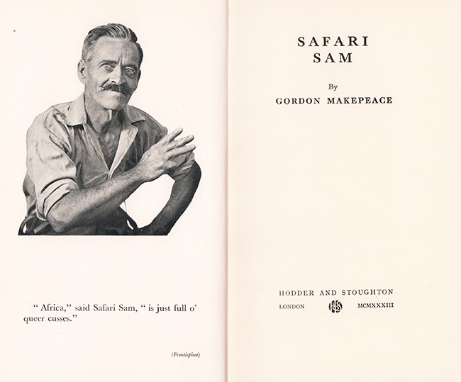 Czech (Kenneth) AN ANNOTATED BIBLIOGRAPHY OF AFRICAN BIG GAME HUNTING BOOKS 1785 -1999 Page 179: Makepeace, a journalist, recorded the experiences of “Safari Sam” during a long interview. Sam evidently spent much time in the Northern Rhodesian brush country and relates incidents of encounters with rhino, lion, leopard and crocodile, as well a conversation with a veteran elephant hunter. The frontispiece and plates reveal a bright-eyed Sam in various poses.