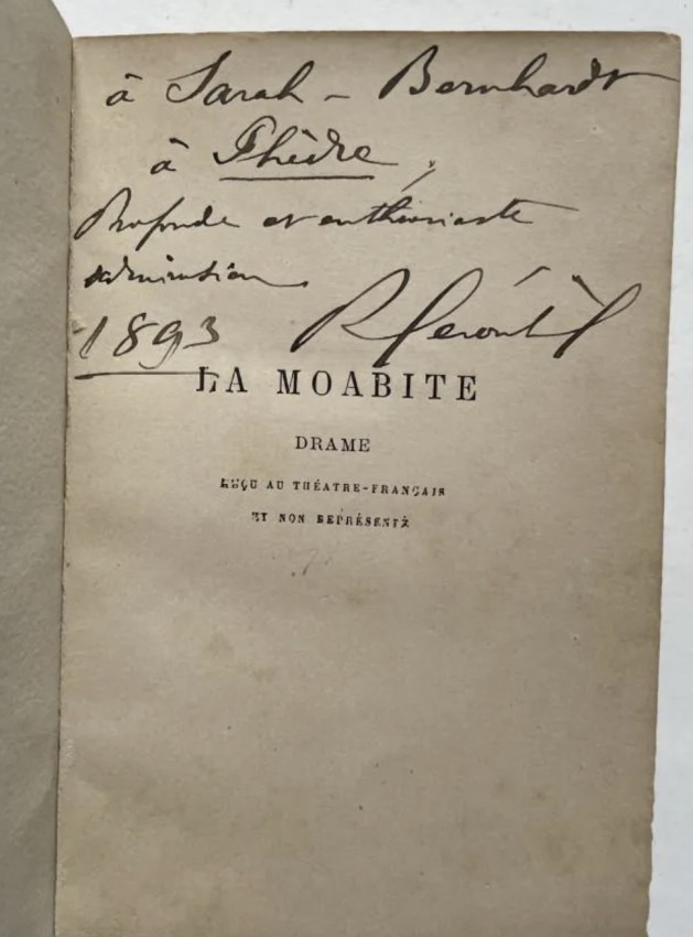 Paul DEROULEDE (1846-1914) La Moabite drame vingtieme edition. Paris: Calmann Levy, 1882. 16mo. Pp. XI, 146. Contemporary vellum-backed marbled paper-covered boards, the flat spine gilt, divided into compartments, with black leather lettering-piece in the second compartment, and gilt 'S.B.' monogram in the fifth, binder’s ticket to front pastedown (somewhat soiled and rubbed [see images]). Provenance: Sarah Bernhardt (half-title inscribed “a Sarah Bernhardt / a Phedre, / Profonde et enthousiaste / admiration / P. Deroulede 1893”, binding)