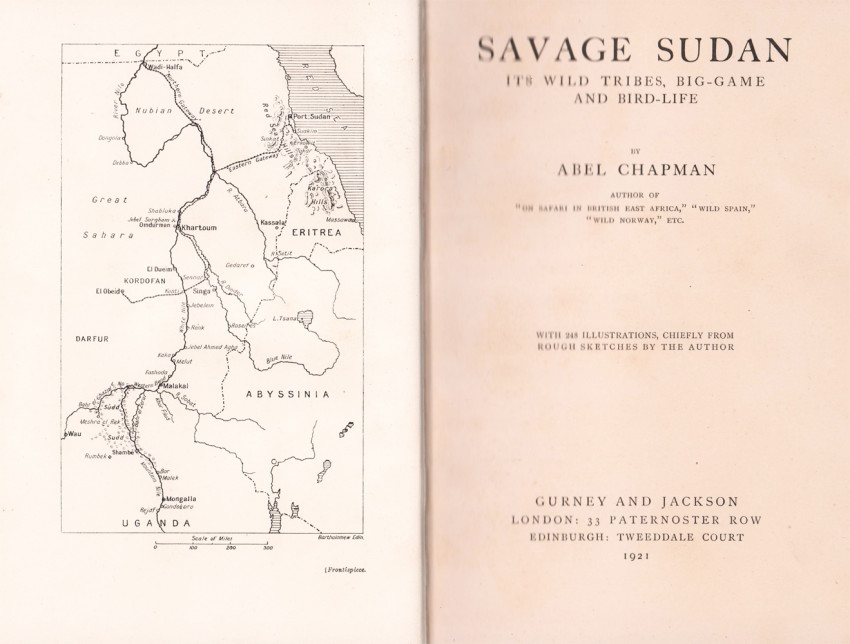 Czech (Kenneth) An Annotated Bibliography of Big Game Hunting Books 1785 - 1999 page 60: Chapman recounts his journey to Khartoum, then up the White Nile inot Uganda. He hunted gazelle in the arid regions of the Sudan, then stalked tiang, hartebeest and roan near the Sobat River. As he continued up the White Nile, he bagged waterbuck, kob and lechwe. There are exciting encounters with buffalo, hippo and elephant, the lateer near the Zeraf River. Additional hunting for rhino and eland took place near the Blue Nile and Dinder Rivers.