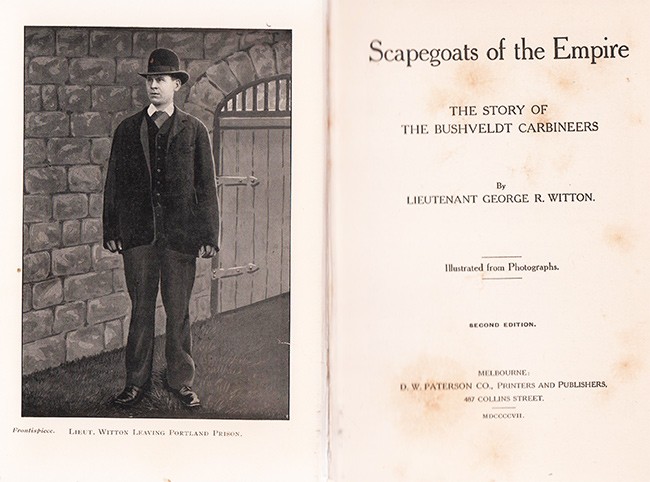 ‘The court of inquiry - the British court martial convened in Pretoria to try Australian officers of the Bushveldt Carbineers for shooting Boer prisoners. The trial and its outcome - the execution of Harry Morant, Peter Hancock and the sentencing of George Witton to life imprisonment - has intrigued many writers. Was this true military justice or were the defendants indeed scapegoats sacrificed to political expediency? Here, at last, after many years in obscurity, is the story told at first hand. It is George Witton's own straightforward account of events which led to the controversial trial, of the trial itself and later of his prison life. There is some mystery surrounding the first publication of 'Scapegoats of the Empire' in 1907. Two editions were published in that year but very few copies are found today. A story exists that a fire in the printery destroyed one edition but rumours persist that the book was censored. Whatever the reasons for past silence, it is time George Witton’s quite candid voice was heard again in his own defence. In his well-researched afterword to this edition Geoffrey Embleton has presented some startling evidence in the form of a letter from Witton to his defence counsel, Thomas. Lodged at the Mitchell Library and marked at Thomas's request, "Not to be opened until 1970" the letter was intended to reveal the whole truth when that truth could no longer hurt the descendants of those involved. Perhaps one man's truth is not the whole truth, but Witton's view at the least adds a new dimension to this fascinating and painful story.' Editor's note to the new edition published by Angus & Robertson, Sydney, 1982.