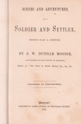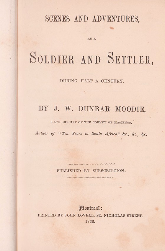 Mendelssohn (Sidney) South African Bibliography volume 2 page 51:Major Moodie left South Africa in 1829 settled in Canada in 1832, serving for some time in the "Provincial Militia," and being afterwards raised to the rank of Captain and Paymaster. Later on he was selected for the post of Sheriff of Hastings, an appointment he retained for many years, but he subsequently employed a Deputy Sheriff, and in doing so “unwittingly transgressed the law in the transaction," involved himself in a series of lawsuits, and was finally compelled to relinquish his appointment. Mr. Moodie states in the Introduction, “I look to this little book as a means of support for my wife, now advanced in years, and myself," and he relates many interesting details respecting his career, and the fortunes of other members of the Moodie family. The five chapters entitled South Africa and its inhabitants are, in the main, reproduced from the author's earlier work, Ten Years in South Africa.
