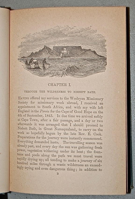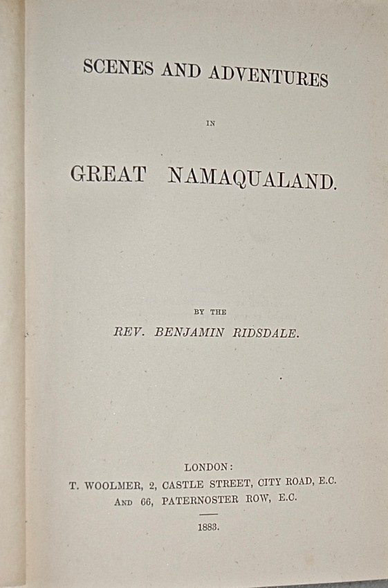 Late in 1843 the Rev. Ridsdale, newly arrived from England, set out from Cape Town with his wife on a 600-mile journey to the mission at Nisbett Bath in Great Namaqualand just as the dry season had begun. Extracts from his journal extending over the four subsequent years spent as a Wesleyan missionary with descriptions of the country and its people. Near Fine.