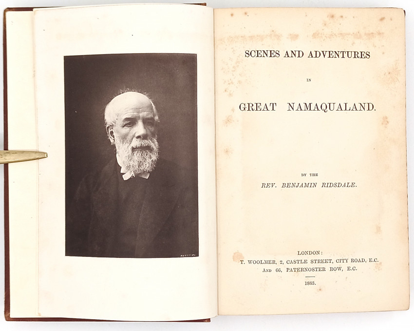 Dictionary of South African Biography Vol.3 page 716: A Weslyan missionary, Ridsdale arrived in Cape Town in 1843. He was appointed to take over the Nisbett Bath (Warmbad) circuit in the south of Namaqualand. The wanderings of the nomadic tribes, caused by desert conditions, made effective supervision difficult. Nevertheless at chosen places, one at least 320 kilometres from Nisbett Bath, substations were formed under the leadership of Hottentot preachers and teachers, among them David Afrikaner, a chief. Ridsdale sometimes with his wife, visited the outposts by wagon or on horseback to preach and converse with the people. His experiences are related in this book in interesting style, and his comprehensive account of the origins of the Bushmen, and of their habits, occupations and customs, make it a valuable book of reference.'