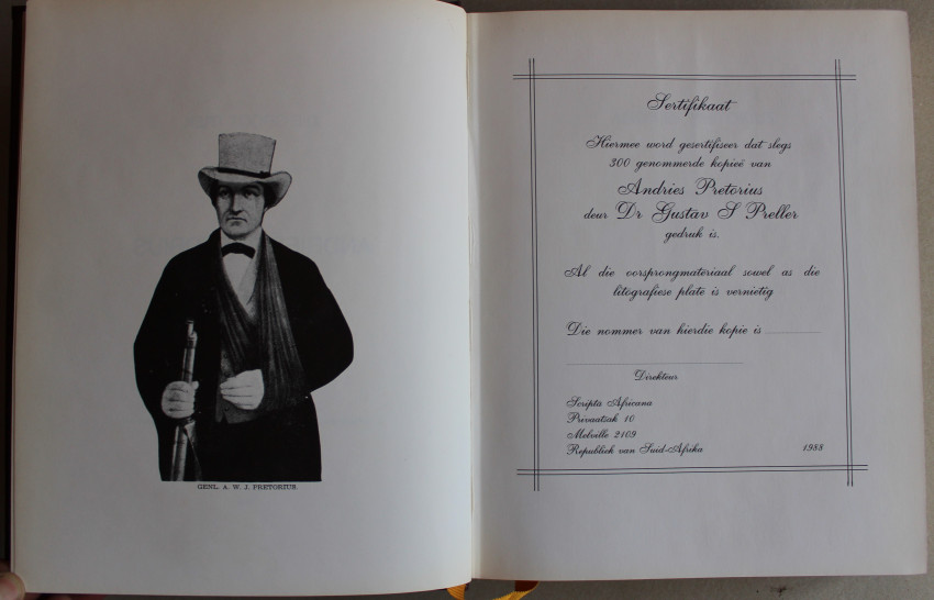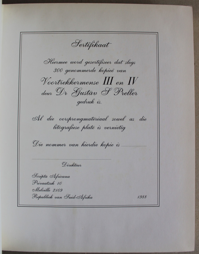 A limited edition of 300 sets printed, consisting of 9 volumes bound in deluxe brown leatherette with lovely gold trim. Voortrekkermense I-VI; Dagboek van Louis Trichardt; Voortrekker Wetgewing; Piet Retief; Voortrekkers van Suidwes; Andries Pretorius.