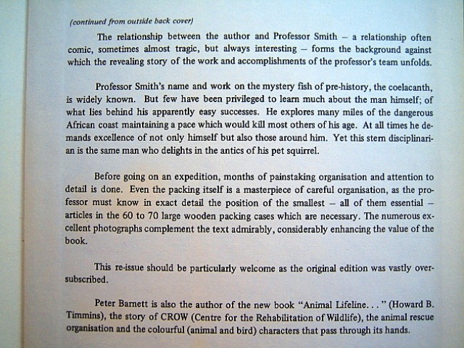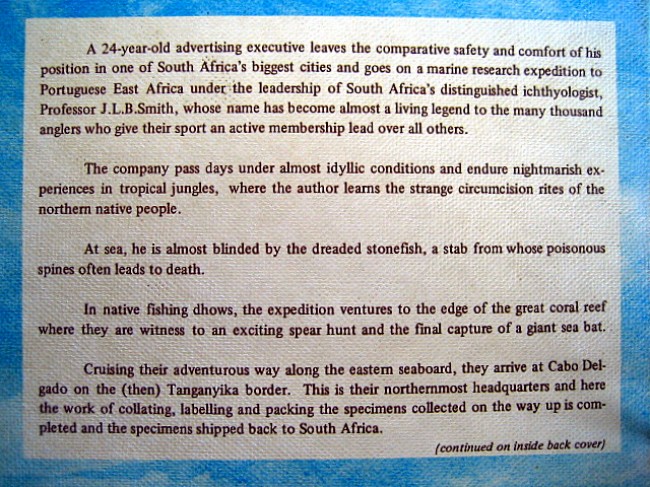 Author was member of the 1951 J.L.B. Smith fishing expedition to the islands of Mozambique and Ibo. He tells the story from his own point of view as photographer and general assistant, with interesting comments on J.L.B. Smith & his wife Margaret.