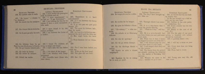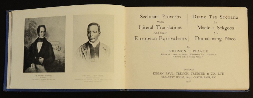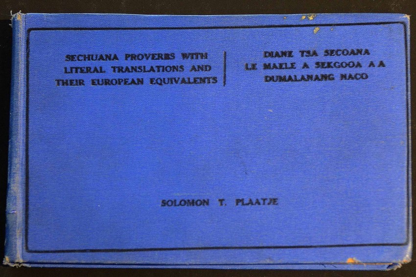 The first edition of this scarce Sol Plaatje book in nice condition. Oblong 12mo. 98pp. Bound in the original blue cloth with black lettering. 17pp. introduction on the Bechuana. 732 Sechuana proverbs with their literal and European equivalents.