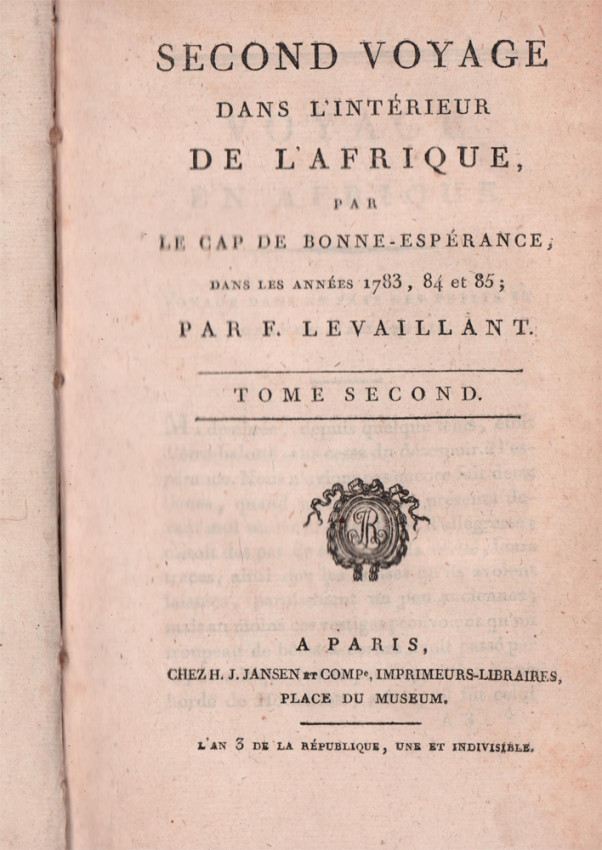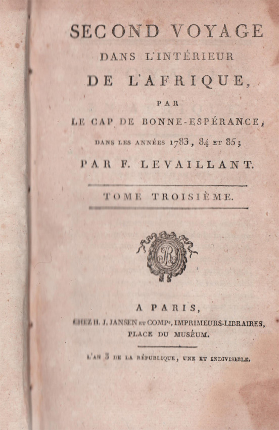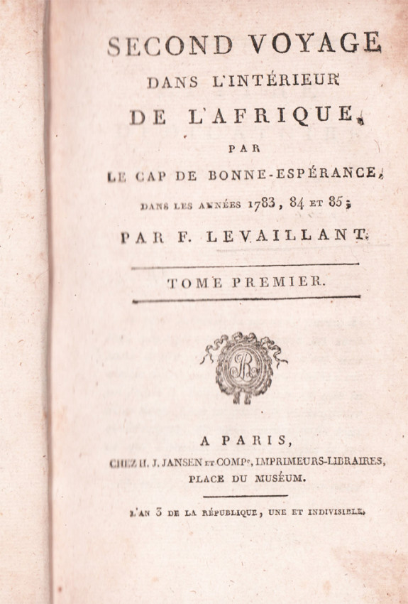 After his return to France Le Vaillant spent years organising his collection and writing up an account of his travels. A description of his first expedition in South Africa, Voyage de M. Le Vaillant dans l'interieur de l'Afrique par le Cap de Bonne-Esperance, dans les annees 1780, 81, 82, 83, 84, & 85, edited by his father, was published in Paris in 1790 (2 vols).