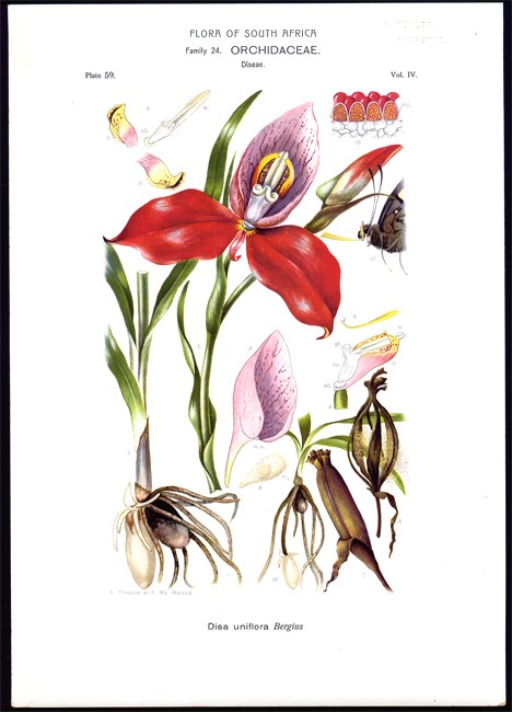 Each plates stamped in blind at the top righ hand corner R. Muller, Kaapstad (Muller\'s were music and booksellers). These plates differ slightly from those in the published volumes of the Flora in that they have the title THE FLORA OF SOUTH AFRICA at the top and a \'Family\' number. It is unknown whether they were run-ons from the original publication or specially printed for sale as separate plates. It is possible they were printed after World War I when the final two volumes of the THE FLORA were issued.