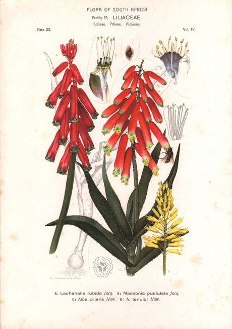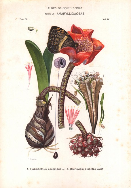 These plates differ slightly from those in the published volumes of the Flora in that they have the title THE FLORA OF SOUTH AFRICA at the top and a 'Family' number. It is unknown whether they were run-ons from the original publication or specially printed for sale as separate plates. It is possible they were printed after World War I when the final two volumes of the THE FLORA were issued.