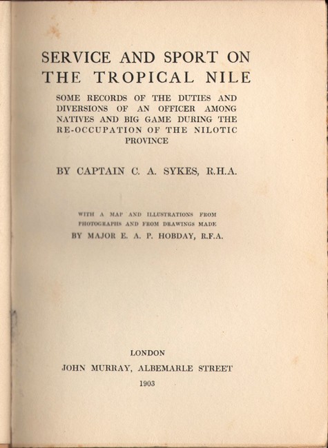 Czech: An annotated Bibliography of African Big Game hunting Books, 1785 to 1950, page 162, ‘Sykes relates his military duties in Sudan along the Nile but also mixes in some exciting elements of big-game hunting. There are two chapters on stalking elephant, one on hippopotamus, and one on rhinoceros, as well as a dash of antelope hunting.’