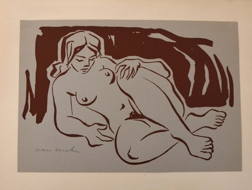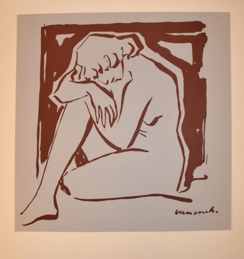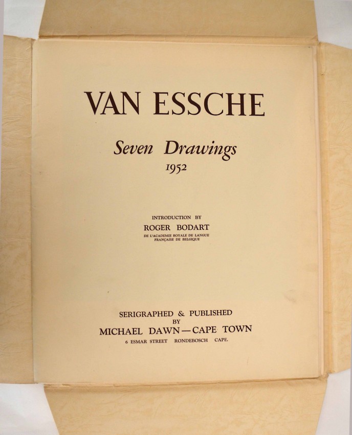 Portfolio of 7 Serigraphs of Nudes in brown/maroon on grey paper tipped on to cream backing sheets. Introduction by Roger Bodart. Enclosed in the original printed portfolio cover (Titled “Seven Drawings”) and further enclosed in a second portfolio cover titled “Nude Studies”. This is No. 16 of 60 copies of the very scarce limited signed edition with each graphic signed by Van Essche in pencil on the image. There is an unsigned and unnumbered edition which is also scarce, where the prints have been signed on the block and are printed in the same brown/maroon ink as the drawings. The last image provided is from the regular edition to illustrate this point and purely for comparison. The only copies of this regular edition that I have seen are enclosed in the inner “Seven Drawings” cover and lack the outer "Nude Studies" cover.