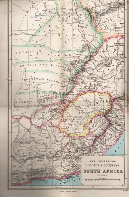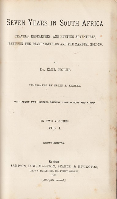 'Holub describes his first three expeditions to the remoter regions of southern Africa in the 1870's.Emil Holub's compelling ambition was to follow in the footsteps of Dr Livingstone and, specifically, to reach Luanda by way of the Zambesi valley and across Angola. That he failed in his principle objective does not diminish his stature as a traveller-explorer nor, indeed, the fascination which modern readers will derive from his meticulous accounts of the journeys, the third of which took him to the upper reaches of the Zambesi River. Holub was eminently qualified to undertake travel in the Africa of his day. He was a doctor of medicine, a zoologist, a botanist, a hunter and taxidermist, an artist and cartographer, an avid collector of specimens and, above all, a keen observer. Where Livingstone broke new ground Holub followed to consolidate, to record, to add detail to the broad canvas painted by his eminent predecessor.' Editor's note to the reprint edition, Johannesburg, 1975.