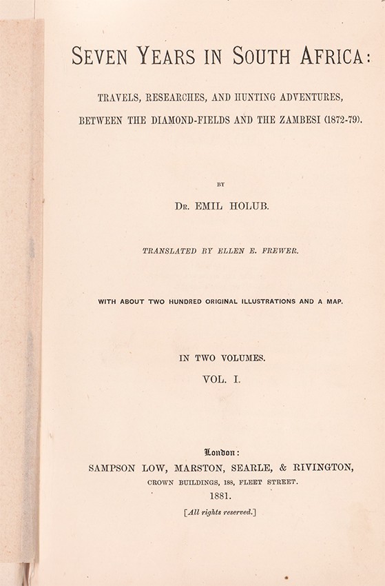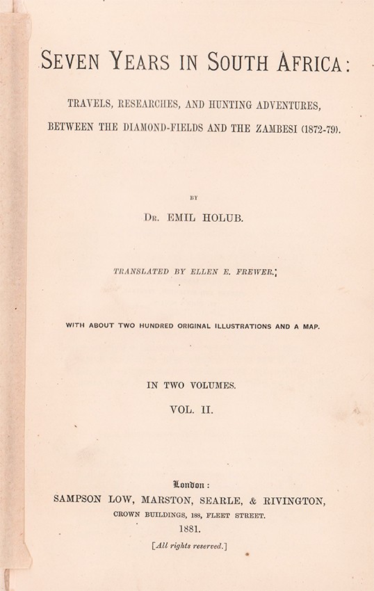 Holub was eminently qualified to undertake travel in the Africa of his day. He was a doctor of medicine, a zoologist, a botanist, a hunter and taxidermist, an artist and cartographer, an avid collector of specimens and, above all, a keen observer. Where Livingstone broke new ground Holub followed to consolidate, to record, to add detail to the broad canvas painted by his eminent predecessor.' Editor's note to the reprint edition, Johannesburg, 1975.