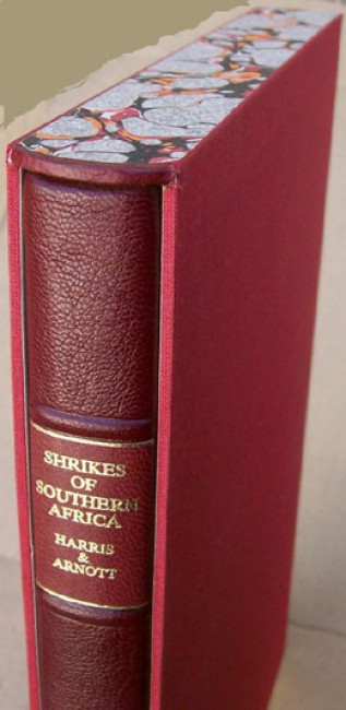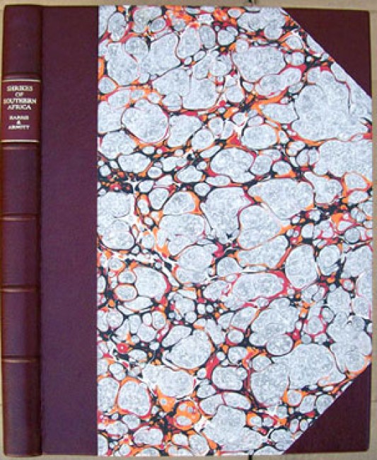 Housed in a dark maroon cloth covered slip case which has hand marbled paper and leather trim to match the maroon coloured leather spine with a title label and marbled paper covered boards.