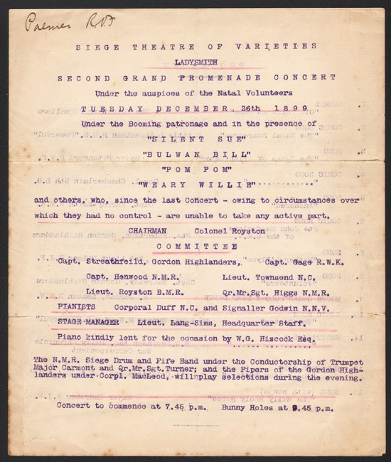 SECOND GRAND PROMENADE CONCERT. Under the auspices of the Natal Volunteers. Tuesday, December, 26th 1899. Under the Booming patronage and the presence of “Silent Sue”, “Bulwan Hill,” “Pom Pom,” “Weary Willie,” and others, who, since the last concert – owing to circumstance over which they had no control – are unable to take an active part. Chairman; Colonel Royston.
