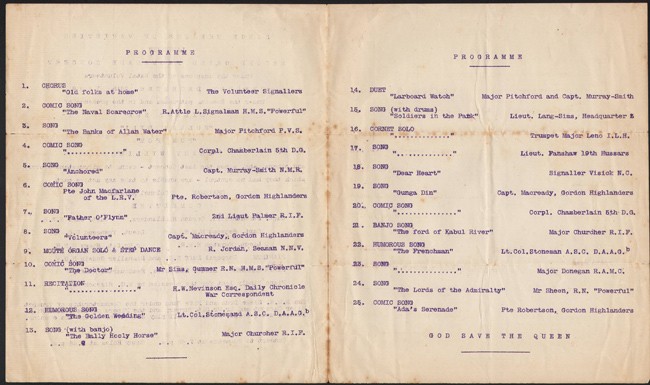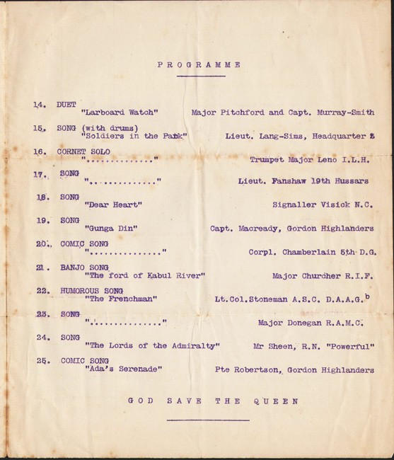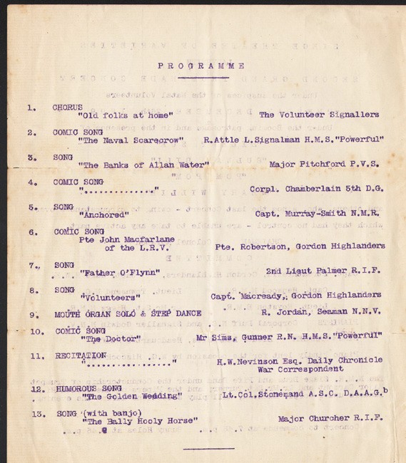 Signed Palmer R.I.F. (Royal Inniskilling Fusiliers?) at the top of the front page. Item 7 on the programme is; SONG, “Father O’Flynn”, by 2nd Lieut Palmer R.I.F.