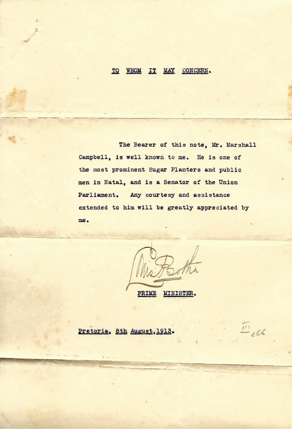 One page autograph testimonial signed by Louis Botha as Prime Minister con concerning the sugar baron Marshall Campbell. "To Whom It May Concern - The Bearer of this note, Mr. Marshall Campbell, is well known to me. He is one of the most prominent Sugar Planters and publc men in Natal, and is a Senator of the Union Parliament. Any courtesy and assistance extended to him will be greatly appreciated by me. Signed Louis Botha, PRIME MINISTER. Pretoria, 8th. August, 1913."