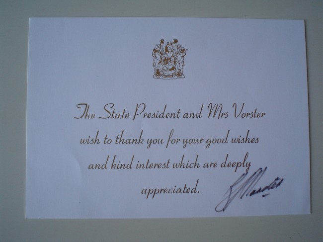 A State President Card from Vorster signed in ink. A Christmas card and black and white photograph signed by Swart and his wife Nellie.