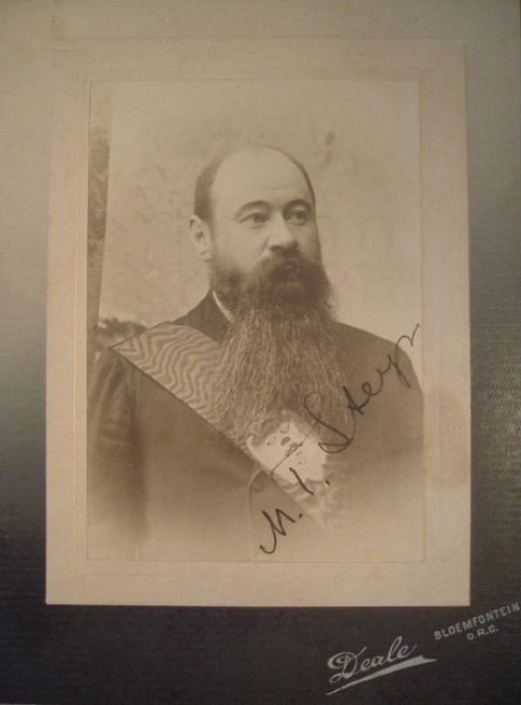 A photograph laid down on board, signed by President Steyn of the Orange Free State. Printed below on the mount: \"Deale, Bloemfontein, O.R.C.\" Mount unevenly faded, stained on reverse