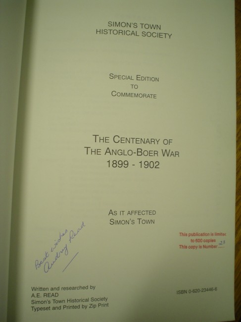 A special edition to commemorate the Centenary of the Anglo-Boer War 1899-1902. This publication is limited to 600 copies and this is copy number 23. 95 pages and index 5 pages.