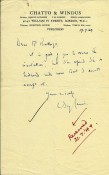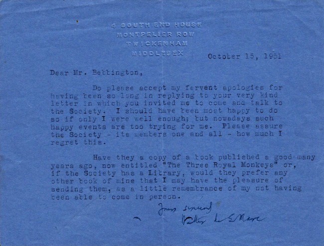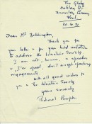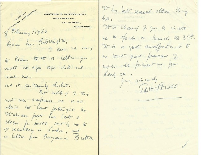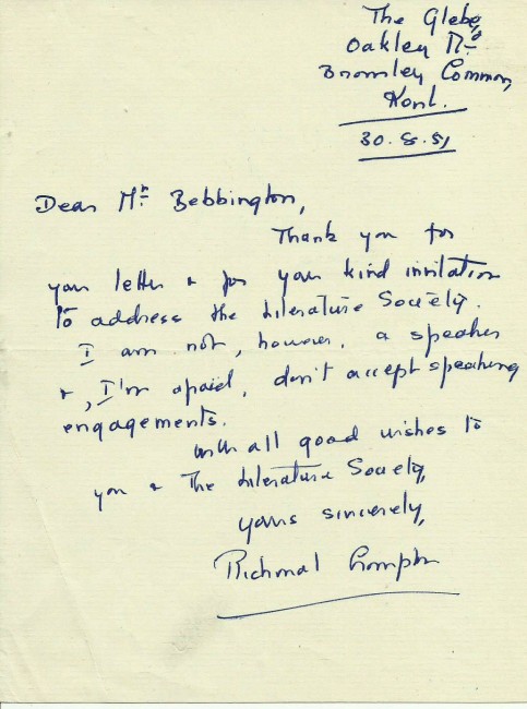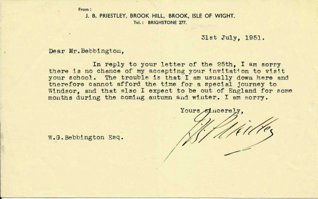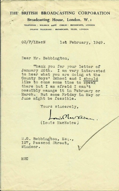 Six letters to a Mr. Bebbington, apparently a teacher at the County Boys' School, mainly concerning invitations to talk at the school. From 1.Louis MacNeice, 1pp.tls. on BBC letterhead. 2. Richmal Crompton, 1pp.als. 3. C.Day Lewis, 1pp.als. on Chatto & Windus letterhead. 4. Edith Sitwell, 2pp. als. discussing the poor postal service and mentioning Benjamin Britten. 5. Walter de la Mare, 1pp.tls. 6. J.B. Priestley, 1pp. tls. All in nice condition - two with paper clip marks.